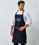 70% cotton/30% polyester. Easy care fabric. Contrast neckband with adjustable metal buckle. Contrast fabric ties with metal eyelets. Reverse contrast denim centre chest pocket and pen pocket. Lower front pocket and pen pocket. Width 72cm. Length 86cm. Industrial laundry 85°C. Domestic wash 60°C.