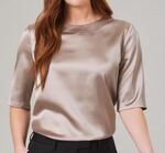 97% Polyester, 3% Elastane - high stretch, easy iron. Semi-fitted, half sleeve, round neck.