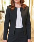 64% Polyester (30% Recycled), 34% Viscose, 2% LYCRA® Elastane. Tailored fit, colarless styling with curved splits, 2 internal jett pockets, curved front/back seams